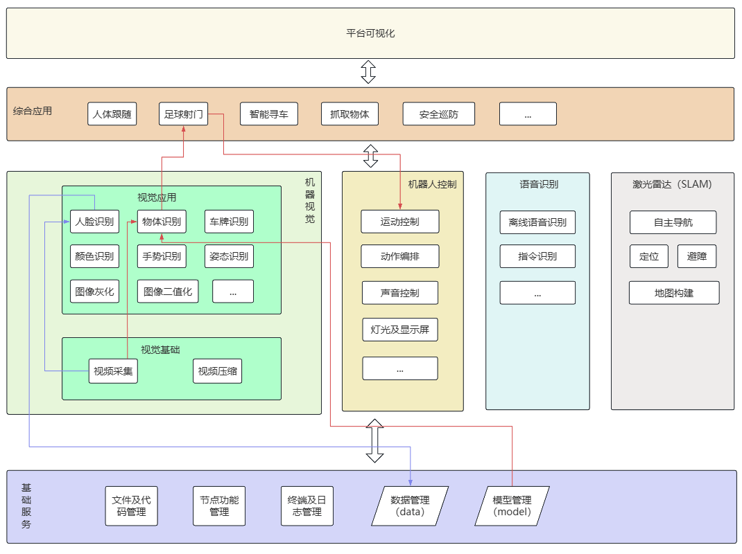 基础功能:机器人基础功能包含机器视觉、机器人控制、语音识别、激光雷达等单一功能。