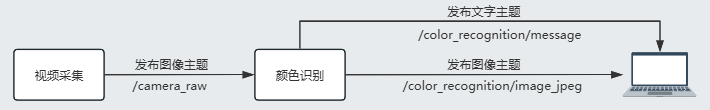 内置节点 color_recognition 订阅 /camera_raw,识别并可视化后发布图像与消息结果。